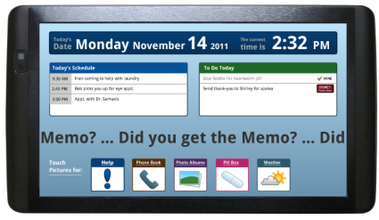 In addition to brain fitness there are memory aids such as Memo that helps people remember appointments, medications, tasks, and other important information. The user needs no knowledge of computers?information is displayed automatically. The Memo always displays the correct day, date, and time, in addition to a message line that repeats important information throughout the day. A calendar, To Do list, phone numbers, Help button, Weather, and photo